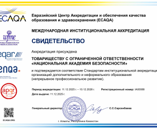 Мы рады сообщить, что ТОО «Национальная академия безопасности» успешно прошла процедуру международной институциональной аккредитации в Евразийском Центре Аккредитации и обеспечения качества образования и здравоохранения (ECAQA). Получение данных сертификатов — это официальное признание того, что наши образовательные программы и внутренние процессы соответствуют высоким мировым стандартам.